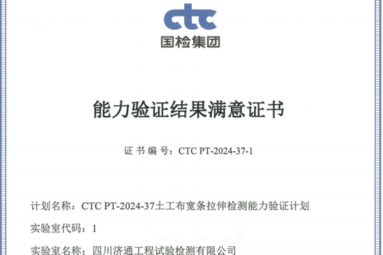 濟通檢測公司參加由中國國檢測試控股集團股份有限公司組織的“CTC PT-2024-37土工布寬條拉伸檢測能力驗證”考核,獲得“滿意”結果...